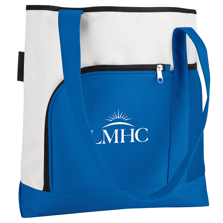 - 600D polyester 2-tone large capacity tote. Bright white with bold color accents; black piping and long handles. Double front pockets: one zipper and one air mesh. 4-3/4 gusset.