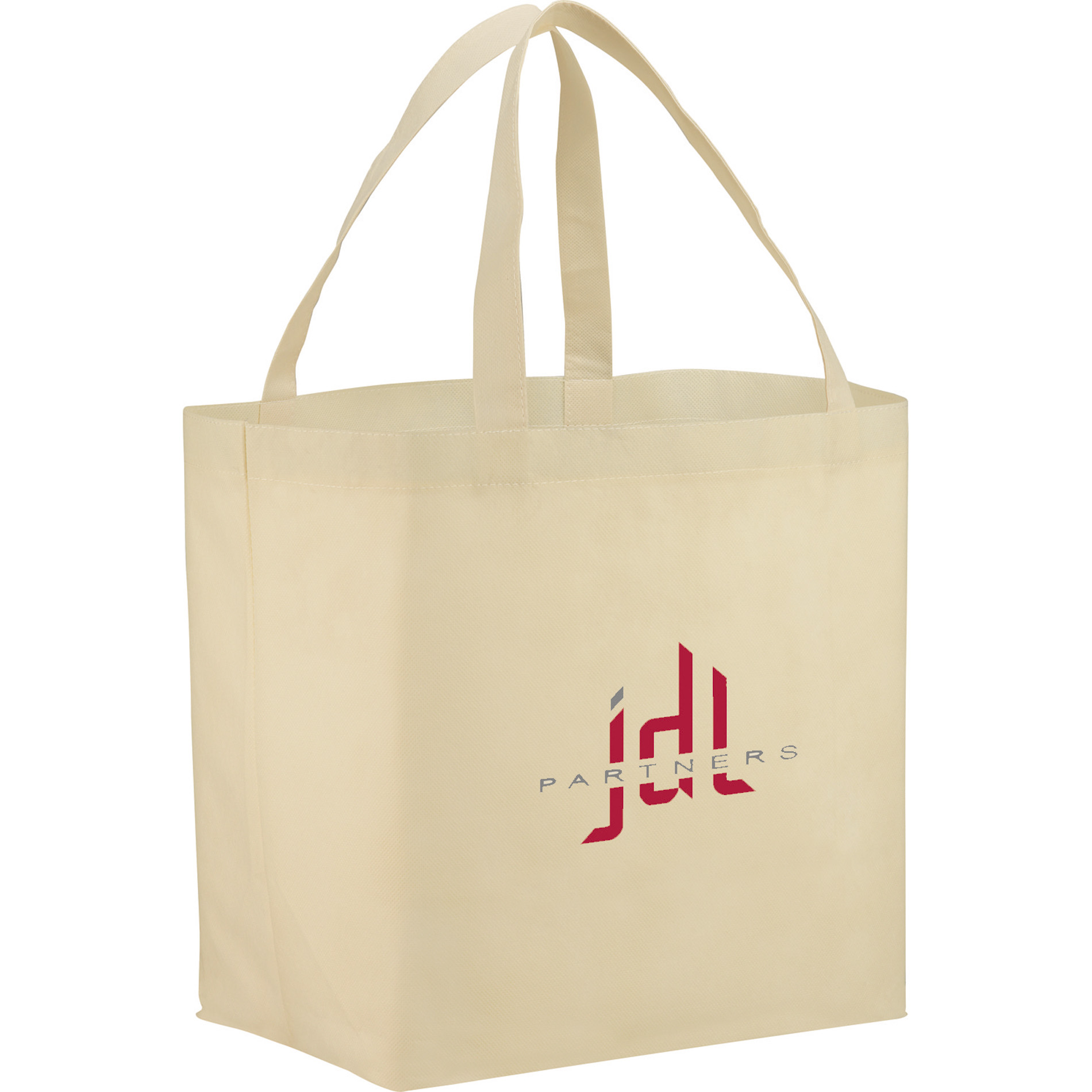 - The YaYa Budget Non-Woven Shopper Tote has a large open main compartment with double 20-inch reinforced handles. It's completely reusable and a great alternative to plastic bags. Gusset & Handle Decorating does not qualify for one day turn. The bag is flared at the top and 19.5" wide when laid flat or when not fully stuffed. The bottom is 12" in width or when the bag is fully stuffed. Polypropylene is recyclable with #5 plastics, please check with your local municipalities for specific rules and regulations. This tote is available in multiple colors.