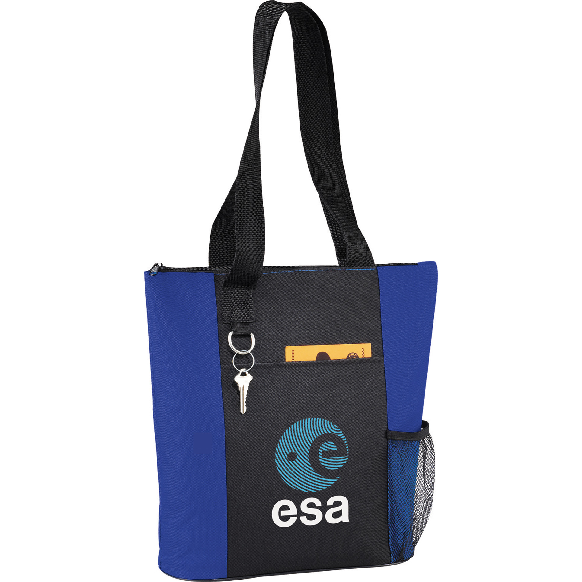 - The Infinity Convention Tote has a zippered main compartment with 11.5" drop-handles, making it easy to store and carry your favorite accessories. It also features an open front pocket to provide you with extra storage, plus a side mesh pocket designed to hold your water bottle. This durable PolyCanvas tote bag includes a key ring and has sturdy handles to provide a comfortable grip.