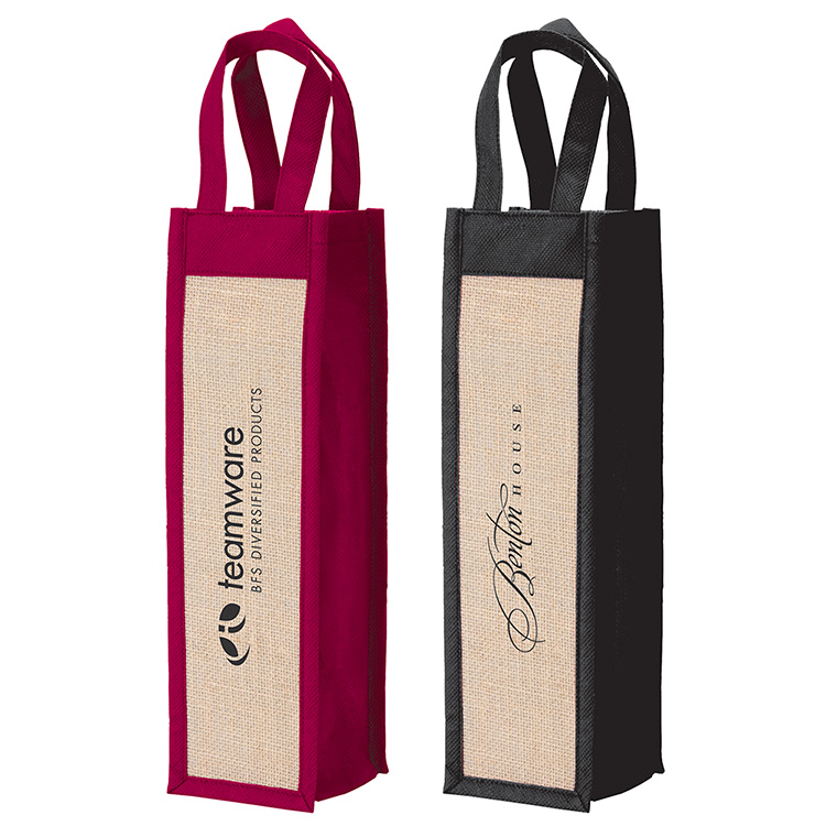 - Laminated natural jute panels with structured bold color polypropylene non-woven material gift tote; matching color handles and non-woven covered base board for reinforcement.
