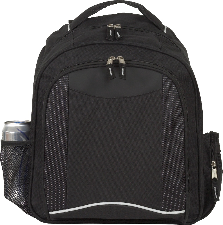 - This backpack fits a lot of features into a compact size. It boasts a mesh water bottle pocket, a zippered main compartment, a zippered front pocket with organizer panel, and a fully padded back and laptop compartment.