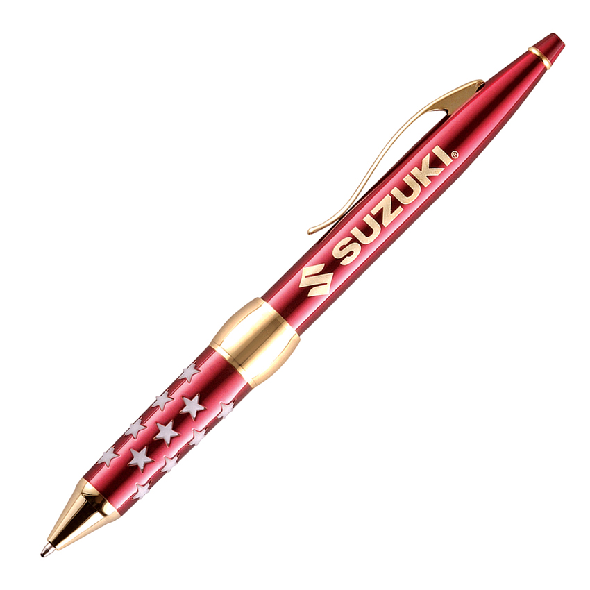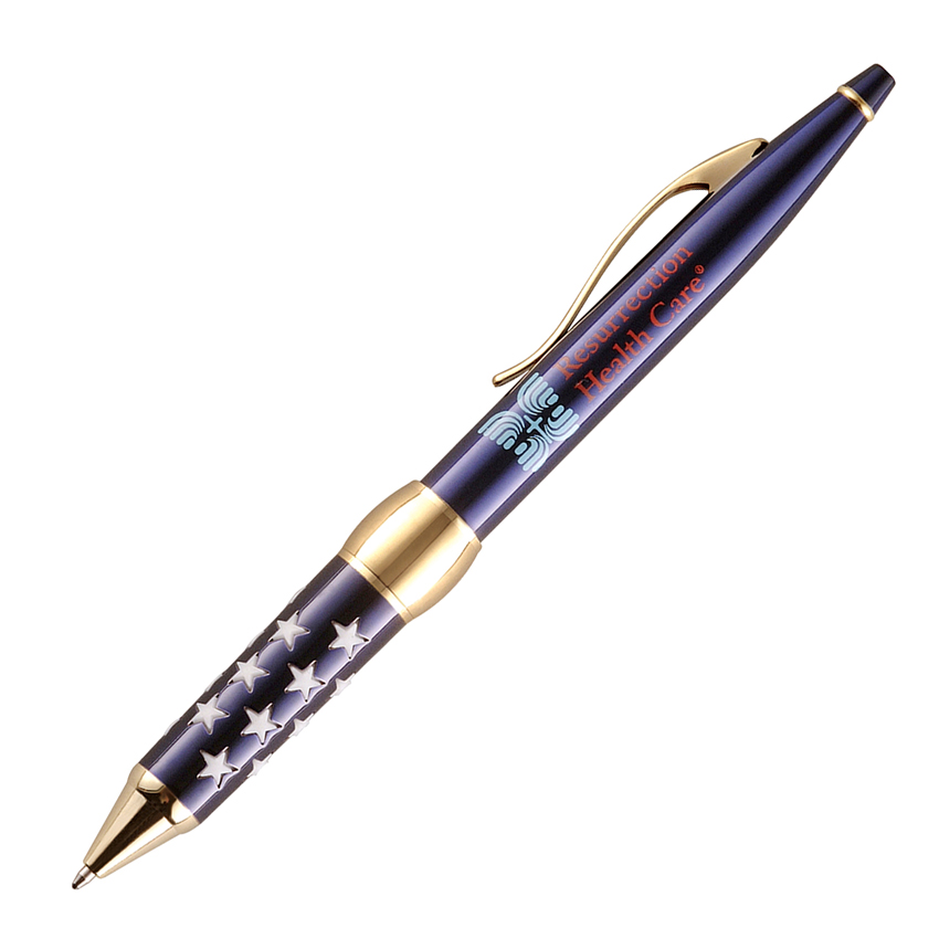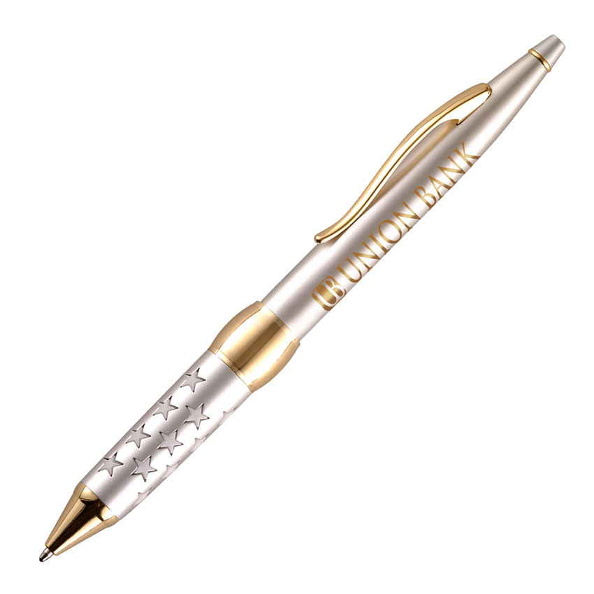 - • Twist action ballpoint pen with rubber star grip and gold accents